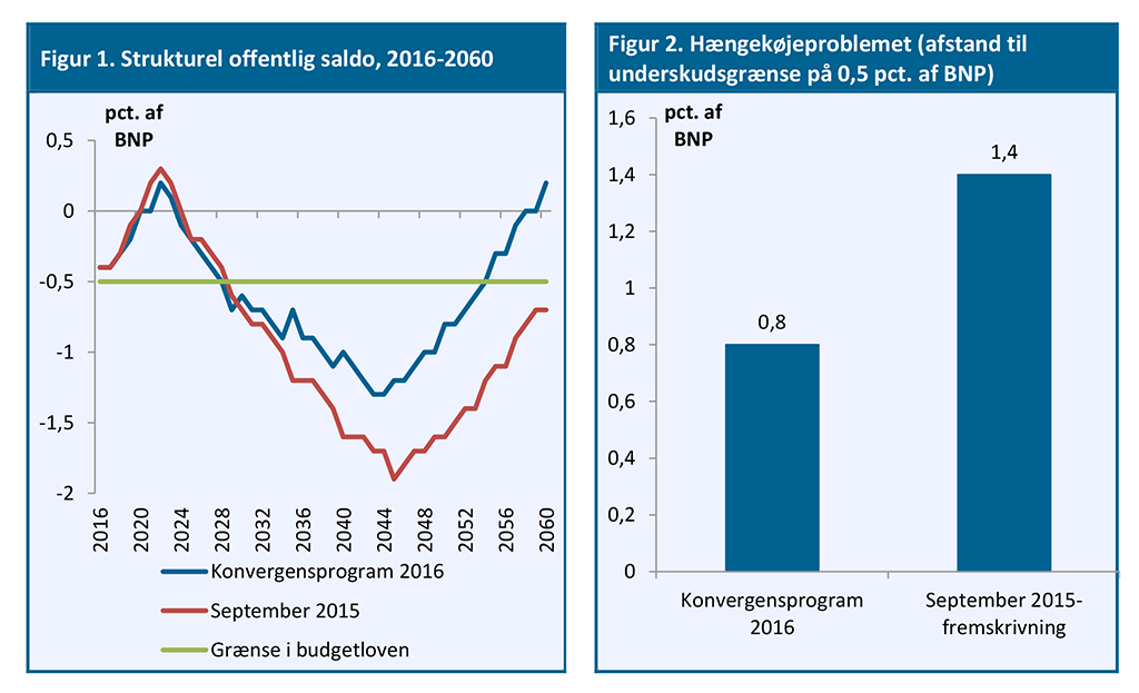 Den estimerede hængekøjeudfordring er de seneste år skrumpet ganske betydeligt. I september 2015 vurderede Finansministeriet, at underskuddet i 2045 ville udgøre 1,9 pct. af BNP – et tilsvarende underskud havde man også i Konvergensprogrammerne for 2013 og 2014. Nu forventes underskuddet at toppe på 1,3 pct. af BNP omkring 2045 i regeringens nye Konvergensprogram 2016, jf. figur 1. Dvs. at afstanden til budgetlovens grænse på 0,5 pct. af BNP næsten er blevet halveret fra 1,4 til 0,8 pct. af BNP, jf. figur 2.