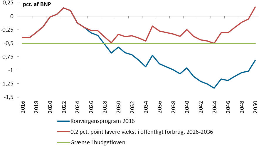 Figur 3. Strukturel saldo ved lavere vækst i det offentlige forbrug, 2016-2050