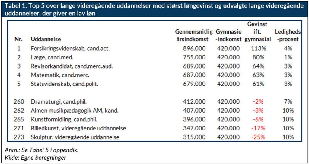 ”Bund 20 er domineret af korte og mellemlange uddannelser, men også et par enkelte LVU’er – bl.a. Skulptur og billedkunst – er i bund 20. Her ligger indkomsten på mellem 315.000 kr. og 369.000 kr., hvilket er mindre end den forventede indkomst på 420.000 kr. for personer, som går direkte fra gymnasiet til arbejdsmarkedet uden yderligere uddannelse. 107 ud af de 611 uddannelser har en forventet gennemsnitsindkomst gennem livet på under 420.000 kr., som er den forventede gennemsnitsindkomst for personer med en gymnasieuddannelse”, siger cheføkonom Mads Lundby Hansen, CEPOS.