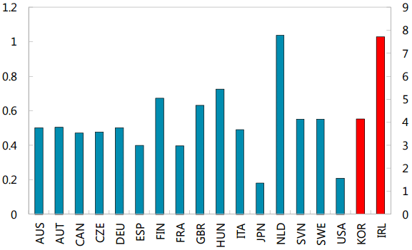 IMF-økonomerne finder, at reduktioner i toldbarriererne i de 18 avancerede økonomier i perioden 1997-2007 i gennemsnit har øget produktiviteten i landene med ca. 1 pct. De vurderer desuden, at man ved en unilateral fjernelse af alle resterende toldbarrierer i et avanceret land vil kunne øge den samlede produktivitet med gennemsnitligt ca. 1 pct. Der er betydelig variation i effekten på tværs af lande fra 0,2 pct. i Japan til 7,7 pct. i Irland, hvor der forventes en specielt stor effekt pga. en stor afhængighed af importerede inputs i landets kemiske industri og medicinalindustri. EU-lande som Tyskland, Storbritannien, Frankrig og Finland forventes at få gevinster i størrelsesordenen 0,4-0,7 pct. jf. figur 1. IMF-økonomerne vurderer derudover, at mange udviklingslande vil kunne opnå større effekter, da de typisk har højere toldsatser. Økonomerne finder, at produktivitetsgevinsterne vil indfinde sig inden for 1-5 år.Era Dabla-Norris og Romain Duval: “How Lowering Trade Barriers Can Revive Global Productivity and Growth”, iMFdirect, 20. juni 2016