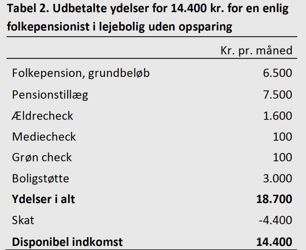 Analysen viser, at en enlig pensionist med ældrecheck har en indkomst efter skat på godt 14.000 kr. om måneden. Det er relativt højt i forhold til andre grupper som fx andre overførselsmodtagere.