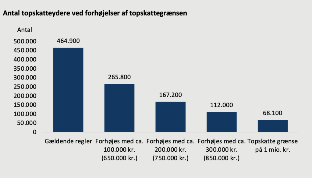Finansministeriet forventer, at der vil være ca. 465.000 topskatteydere i 2025. Forhøjes topskattegrænsen f.eks. med 100.000 kr., bliver 200.000 personer rykket ud af topskatten.