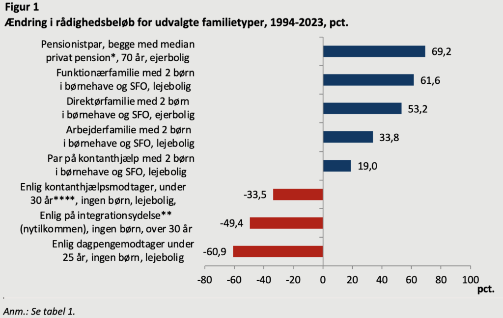 ”Den anden gruppe er dagpengemodtagere under 25 år, der har en indkomst i dag, som er knap 61 procent lavere end i 1994, primært fordi Nyrup sænkede dagpengene for de unge under 25 år. Den tredje gruppe er nytilkomne udlændinge på kontanthjælp/integrationsydelse. En enlig har her oplevet et fald i rådighedsbeløbet på 49 procent fra 1994 til 2023 pga. Løkkes integrationsydelse,” siger cheføkonom Mads Lundby Hansen, CEPOS.