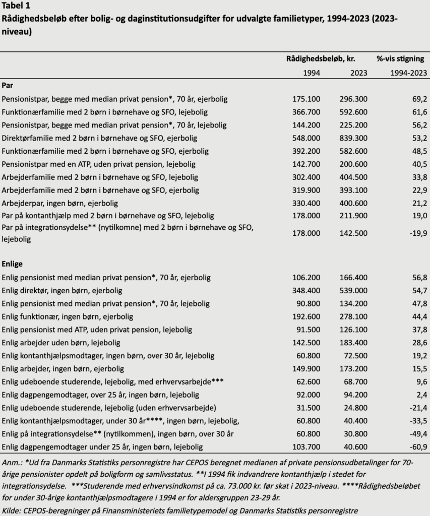 Med udgangspunkt i Finansministeriets familietypemodel har CEPOS beregnet udviklingen i rådighedsbeløbet for en lang række familietyper i perioden 1994-2023. I beregningerne er indkomsten tillagt børne- og boligtilskud, ligesom der er fratrukket skatter og husleje.
