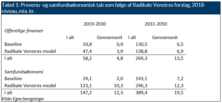 Det gennemsnitlige samfundsøkonomiske tab for Radikale Venstres plan er på. 12,3 mia. kr. om året frem mod 2031, hvilket er inklusive baseline-effekten på 2,0 mia. kr. Det samfundsøkonomiske tab vokser til 19,5 mia. kr. i 2050, hvoraf baseline-effekten udgør 7,2 mia. kr. Til sammenligning er det gennemsnitlige samfundsøkonomiske tab for VLAK-regeringens plan 11,2 mia. kr. frem mod 2030 og 17,8 mia. kr. frem mod 2050, hvilket er inklusiv den samme baseline-effekt som for Radikale Venstres forslag. Altså er det samfundsøkonomiske tab større for de Radikale Venstres plan end for VLAK-regeringens plan. Grunden til dette er, at Radikale Venstre vil forbyde salget af nye konventionelle benzin- og dieselbiler efter 2025, mens VLAK-regerings forbud gælder efter 2030.
