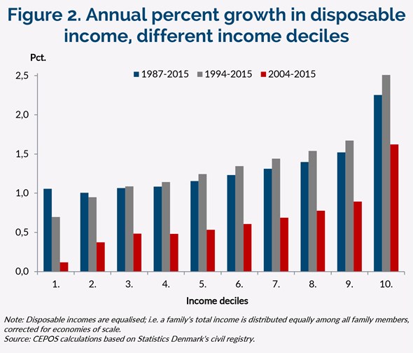 The figure shows the annual growth in disposable income for the 1987–2015, 1994–2015, and 2004–2015 periods for population groups, divided into deciles according to income, in the three respective starting years.[2] For example, the blue bar in the first column shows the average rise in income for the 1987–2015 period for those who were among the 10 pct. with least disposable income in 1987 (and who were still alive and resident in Denmark in 2015).