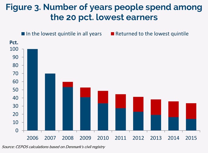 As shown, three out of ten have already left this group after a year. After five years, less than 50 pct. remain in this group, and only 30 pct. remain there for all five years.