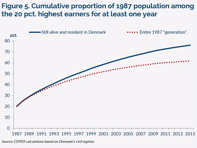Instead, we use a calculation where we take the cumulative proportion of the 1987 population who were among the top 20 pct. of earners for at least one year. This calculation can serve as an illustration of how many citizens at some point in their lives will be among the top 20 pct. in terms of income.
