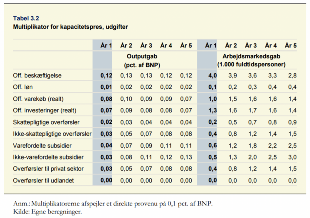 I anmærkningerne til finanslovsforslaget er der ting, der taler for både større og mindre effekter end hvad der er lagt til grund i ovenstående skøn for effekterne af krigskassen. Hvis man f.eks. bruger penge på vaccinationer, så sendes pengene i høj grad til udlandet. Her er der ikke meget aktivitetseffekt. Omvendt hvis man ansætter flere i det offentlige til at kontrollere kompensationsordninger, så kan det give noget ekstra effekt. Men det er begrænset, hvor mange penge man kan bruge på det.