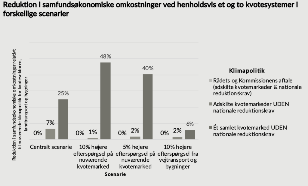 Ved at samle CO2-udledningerne fra vejtransporten, bygninger og den nuværende kvotesektor under et samlet kvotesystem kan de samfundsøkonomiske omkostninger reduceres med omtrent 25% i forhold til den nuværende klimapolitik.