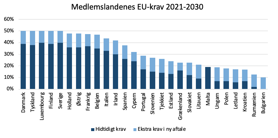 Selvom Danmark kommer til at opfylde det isolerede danske klimamål om 70 pct.-reduktion i 2030, er det slet ikke sikkert, at vi kan opfylde det nye EU-krav til Danmark. Det vil kræve, at de forudsatte store reduktioner i landbruget bliver til noget, og at Danmark udnytter adgangen til at annullere CO2-kvoter, sådan som EU-aftalen giver os lov til.