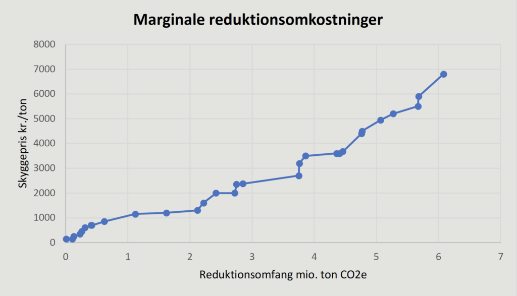 En udvidelse af klimamålet om 70 pct. drivhusgasreduktion til 80 pct. anslås på baggrund af regeringens virkemiddelkatalog at koste 22,4 mia.kr. i årlig samfundsøkonomisk omkostning. Det kræver, at det mest omkostningseffektive redskab tages i anvendelse – dvs. en forhøjelse af CO2e-afgiften og udbredelse til også at omfatte landbruget. Ellers vil det blive væsentligt dyrere.