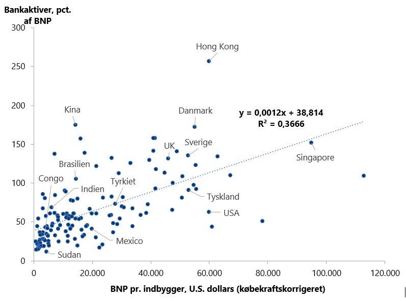 Hvis vi ser på sammenhængen mellem den finansielle sektors størrelse – her målt ved bankernes aktivers størrelse som andel af BNP – og BNP per indbygger, så kan vi se, at der er en ganske tæt sammenhæng.