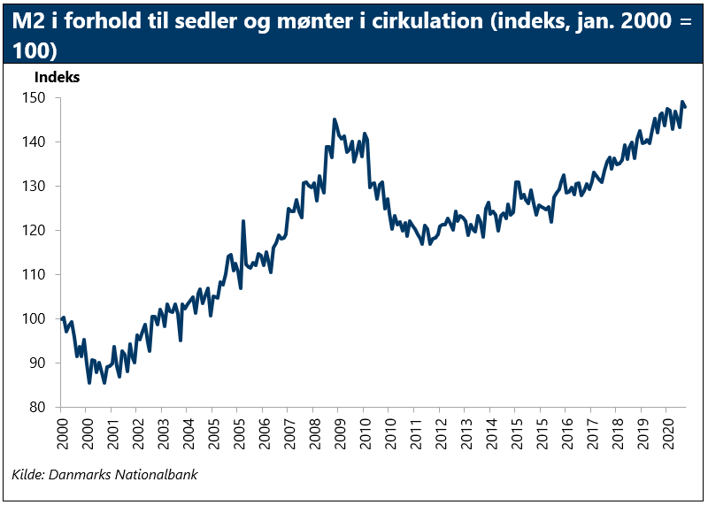 I løbet af de sidste 20 år er den private ’produktion’ af betalingsmidler steget med næsten 50% i forhold til seddel og mønt-mængden svarende til godt 2% om året.