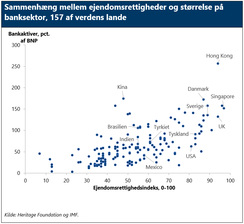 Grafen illustrerer således sammenhængen mellem på den ene side et ejendomsrettighedsindeksmålt på grundlag af tal fra den amerikanske tænketank Heritage Foundation og på den anden side den finansielle sektors størrelse målt som bankernes aktiver som andel af BNP.