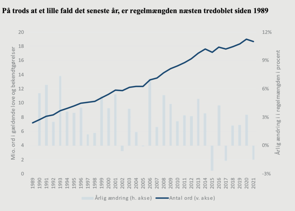 Antallet af ord i statslige love og bekendtgørelser faldt i 2021 med 0,3 mio. ord svarende til 1,5%, men der er ikke tale om reel deregulering. Siden 1989 er regelmængden steget med 11,5 mio. ord svarende til 158%.