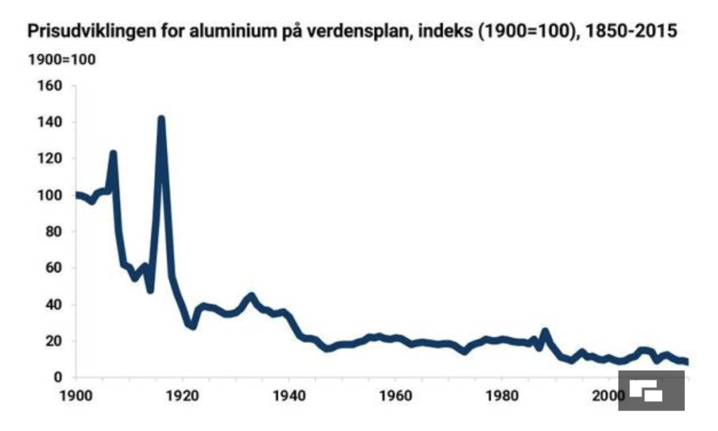 Men i 1886 fandt man ud af at frembringe aluminium gennem elektrolyse. Og herefter er prisen på aluminium faldet dramatisk, jf. figuren: