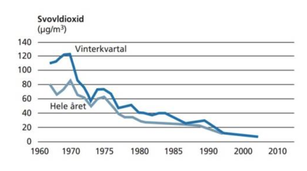 Her ser du udviklingen i forureningen med svovldioxid i København siden slutningen af 1960’erne: